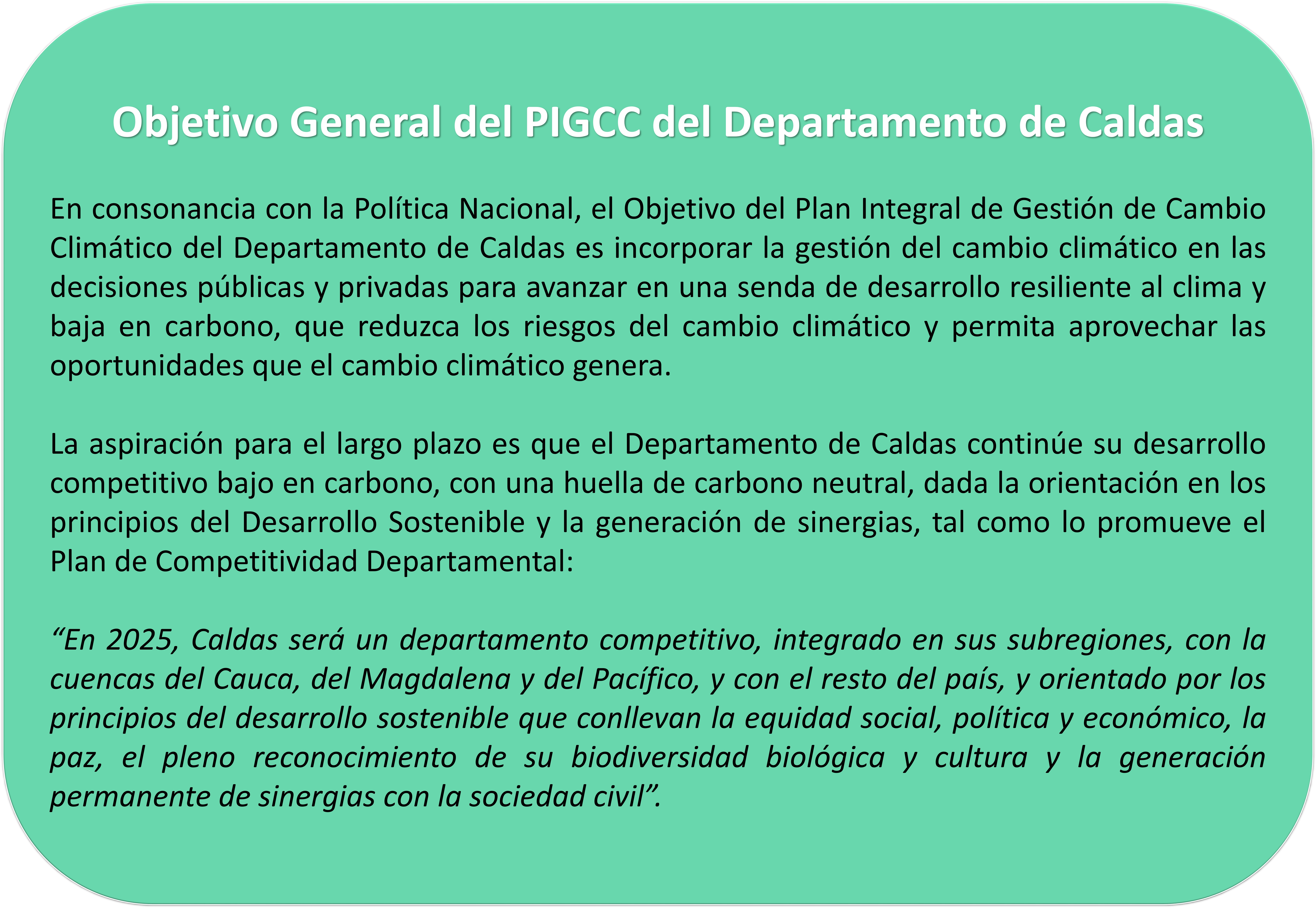 Para el Departamento de Caldas el PIGCC fue adoptado mediante Decreto 0191 de 2020.