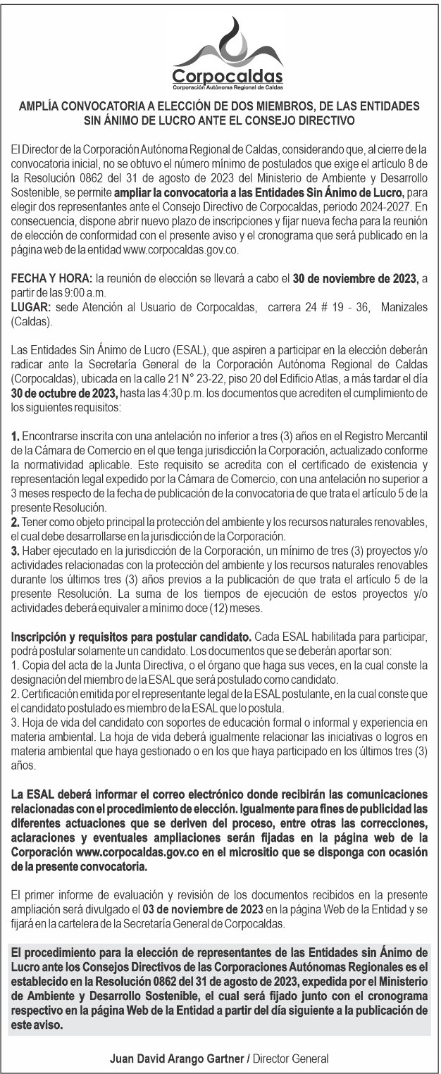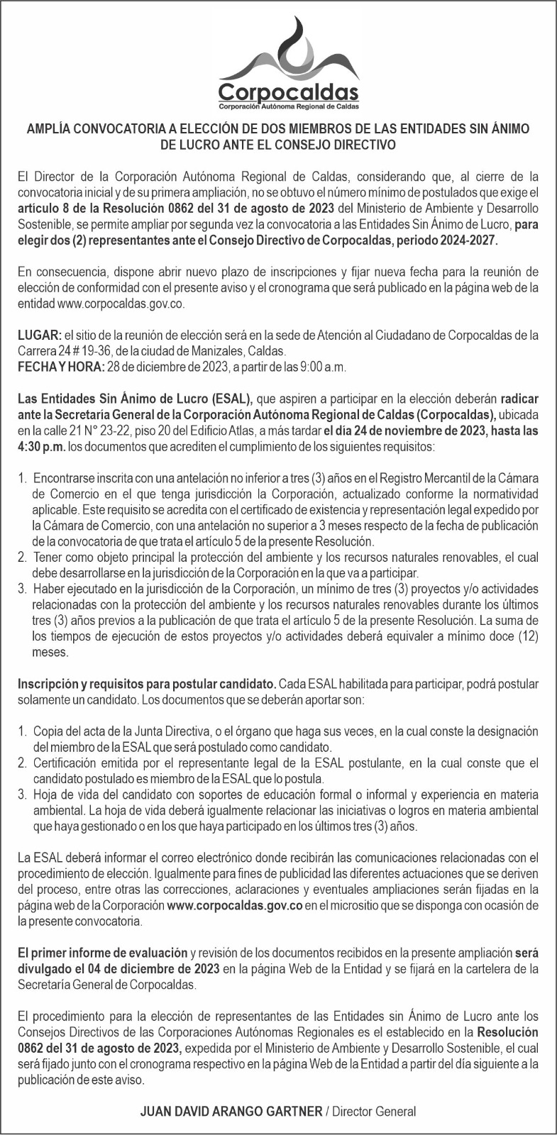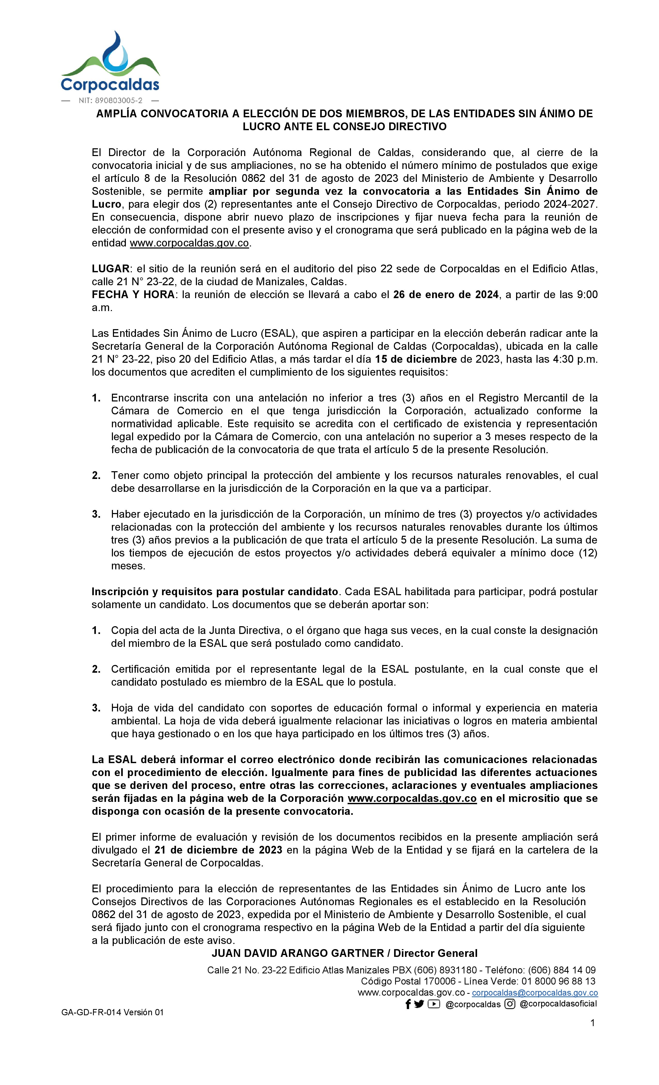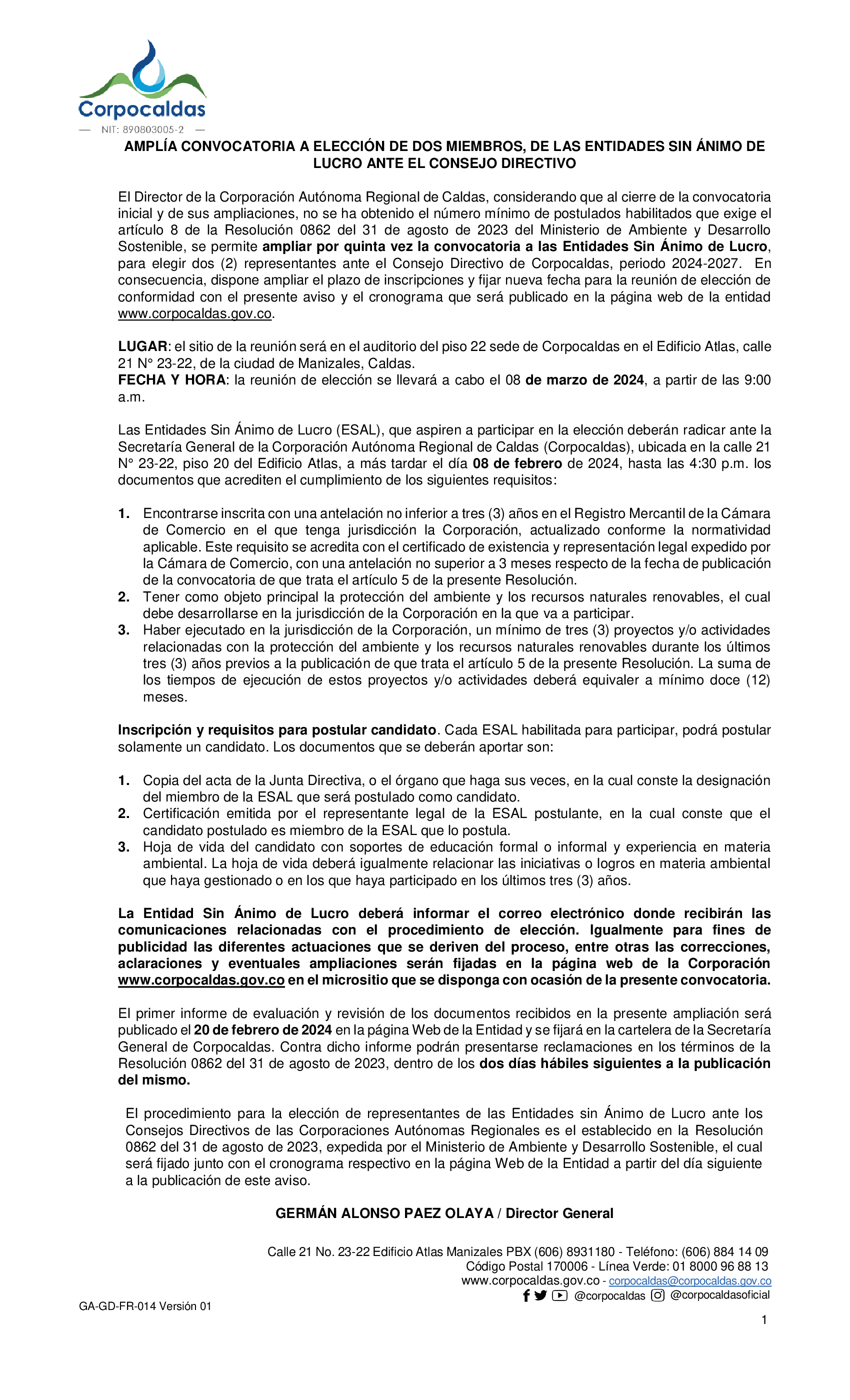 Así mismo, se recuerda a las 23 ESAL habilitadas y a los 5 candidatos habilitados que la reunión de elección se adelantará el día 24 de abril de 2024, a las 2:00 p.m., en el auditorio de Corpocaldas, ubicado en el segundo piso de la sede de la carrera 24 # 19-36 de la ciudad de Manizales.