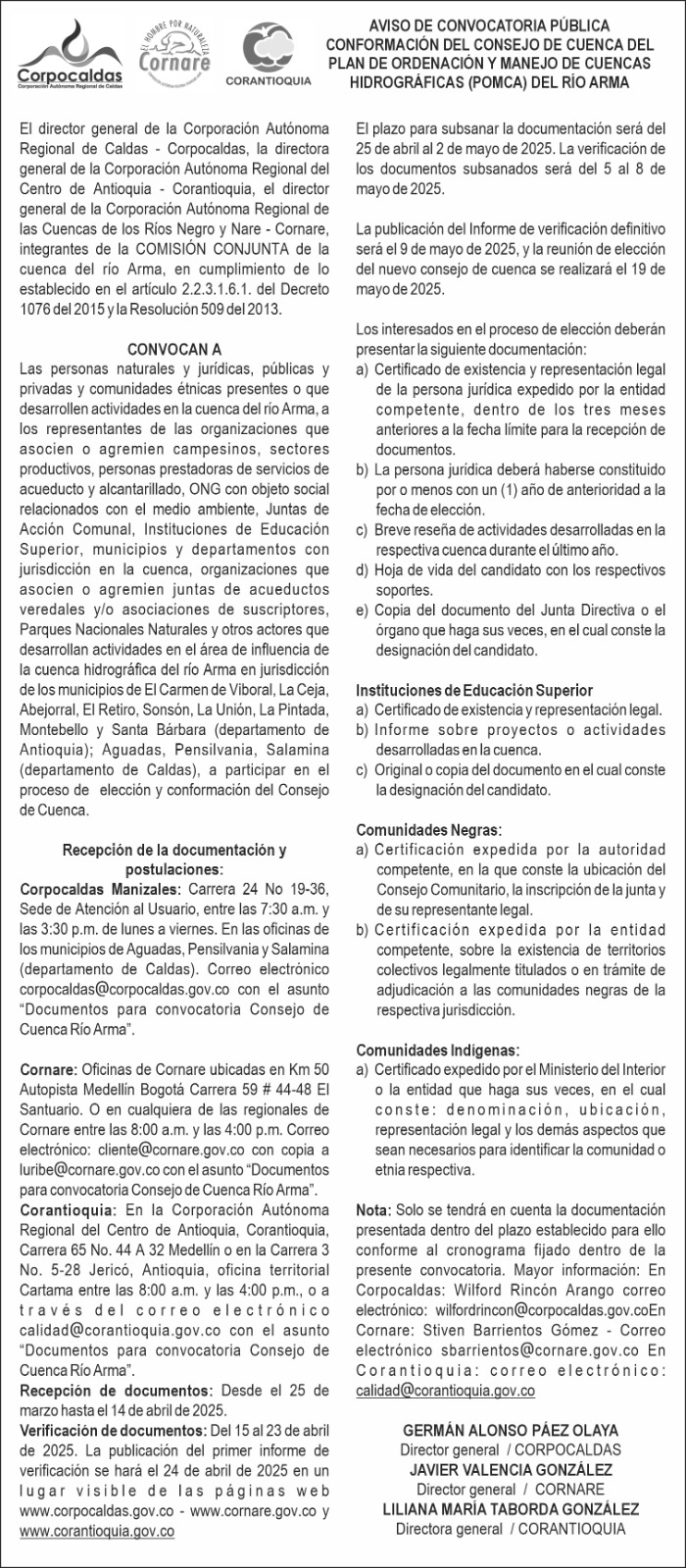 Los documentos se deben enviar al correo: corpocaldas@corpocaldas.gov.co con el asunto: Documentos para subsanación postulación Consejo de cuenca rio Arma, hasta el 2 de mayo 2025.